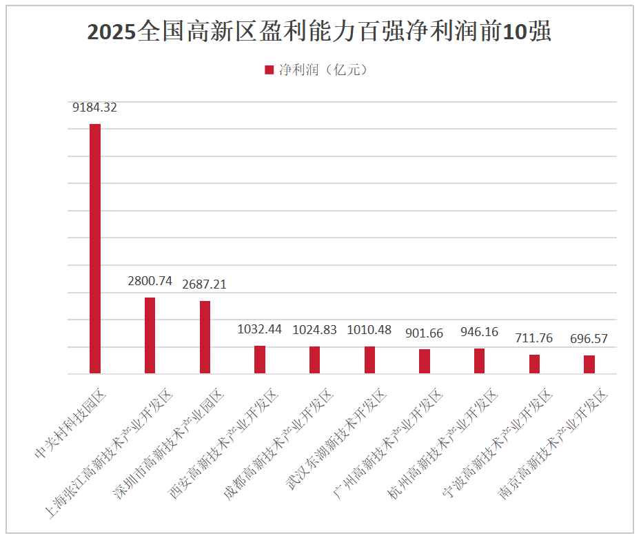 高新区盈利能力百强净利润排名前10的分别是:中关村科技园区、上海张江高新技术产业开发区、深圳市高新技术产业园区、西安高新技术产业开发区、成都高新技术产业开发区、武汉东湖新技术开发区、广州高新技术产业开发区、杭州高新技术产业开发区、宁波高新技术产业开发区及南京高新技术产业开发区。