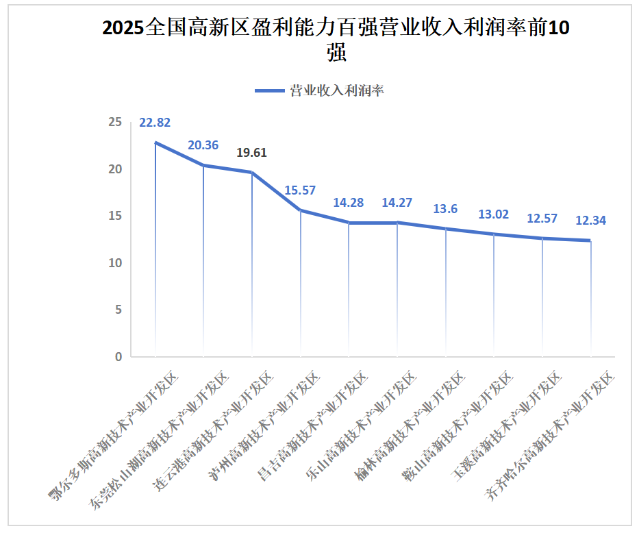 前十强营业收入利润率平均值为15.84%。其中营业收入利润率最高的是鄂尔多斯高新技术产业开发区达到22.82%。百强高新区营业收入利润率平均值为8%,全国高新区营业收入利润率平均值为6.38%。营业收入利润率低于3%的有28个,其中仍有3个高新区营业收入利润率为负值。