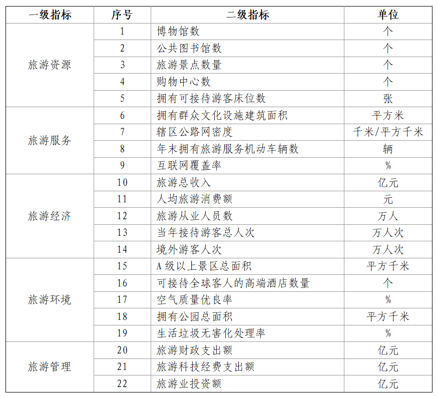 天和全国旅游百强县市区评价指标体系涵盖了资源、服务、经济、环境、管理等多个维度,下设5个一级指标和22个二级指标,旨在全面评估旅游县市区的发展水平和潜力。