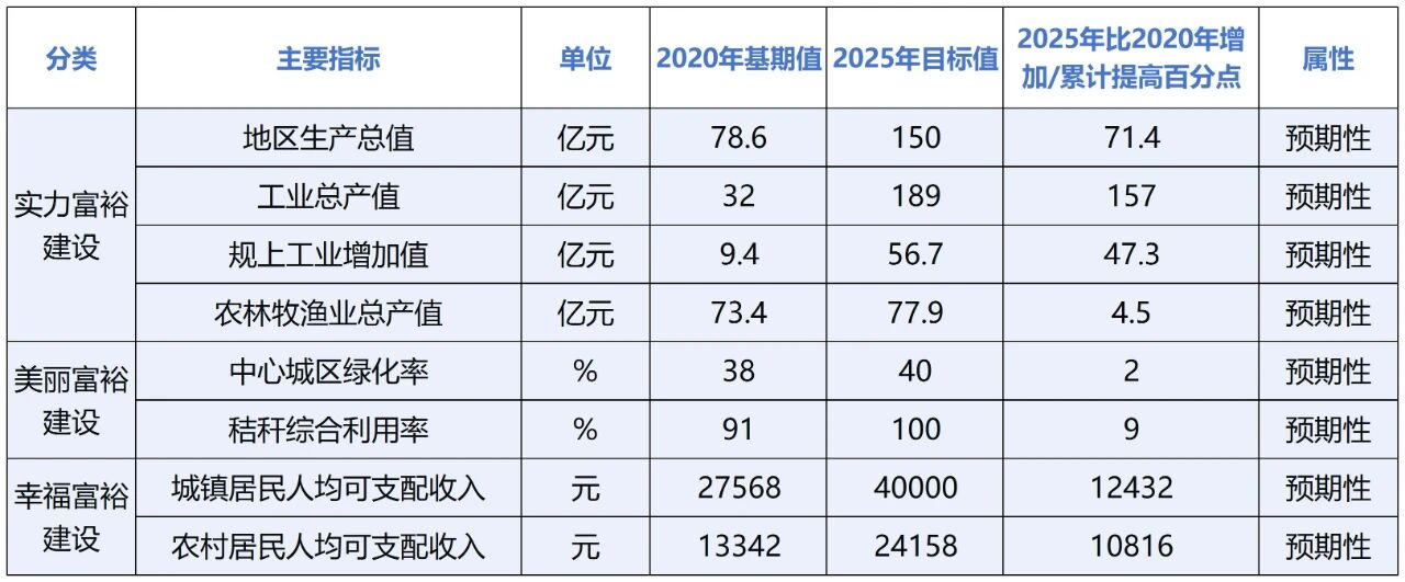 到2025年,富裕县域经济五项综合指标排名将跨入全省十强县,塔哈镇进入全省十强镇,打造全市全面振兴全方位振兴示范县。产业实现集群化发展,主导产业和重点企业具备较强的国内竞争力,新型工业化、信息化、城镇化、农业现代化协调发展新格局基本形成。