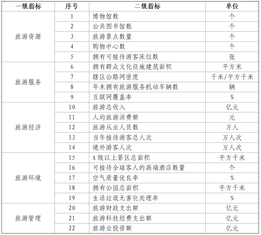 天和全国旅游百强县市区评价指标体系涵盖了资源、服务、经济、环境、管理等多个维度,下设5个一级指标和22个二级指标,旨在全面评估旅游县市区的发展水平和潜力。