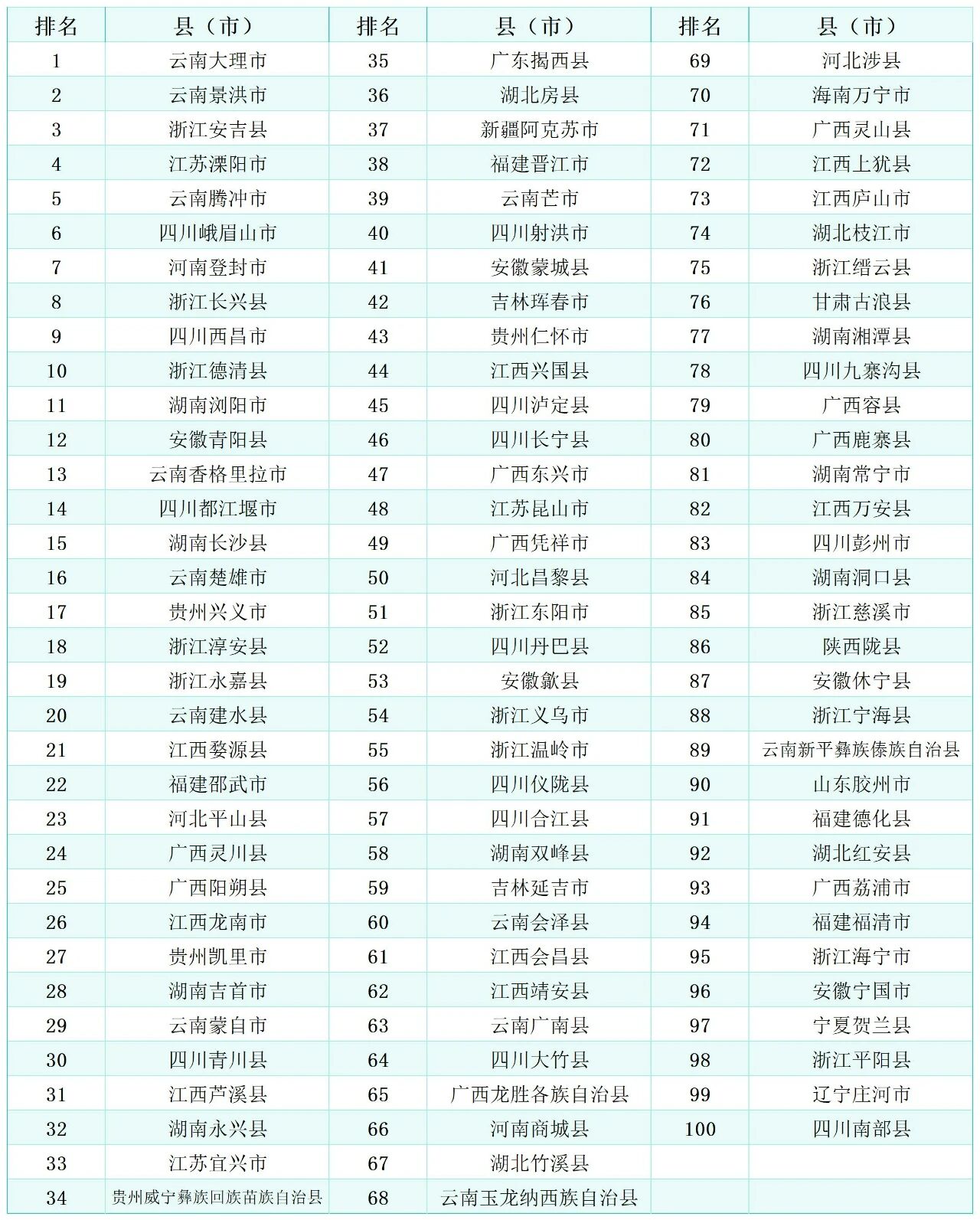 测算结果显示,全国旅游百强县市综合发展指数为70。位居全国前十位的旅游县市分别为云南大理市、云南景洪市、浙江安吉县、江苏溧阳市、云南腾冲市、四川峨眉山市、河南登封市、浙江长兴县、四川西昌市和浙江德清县。