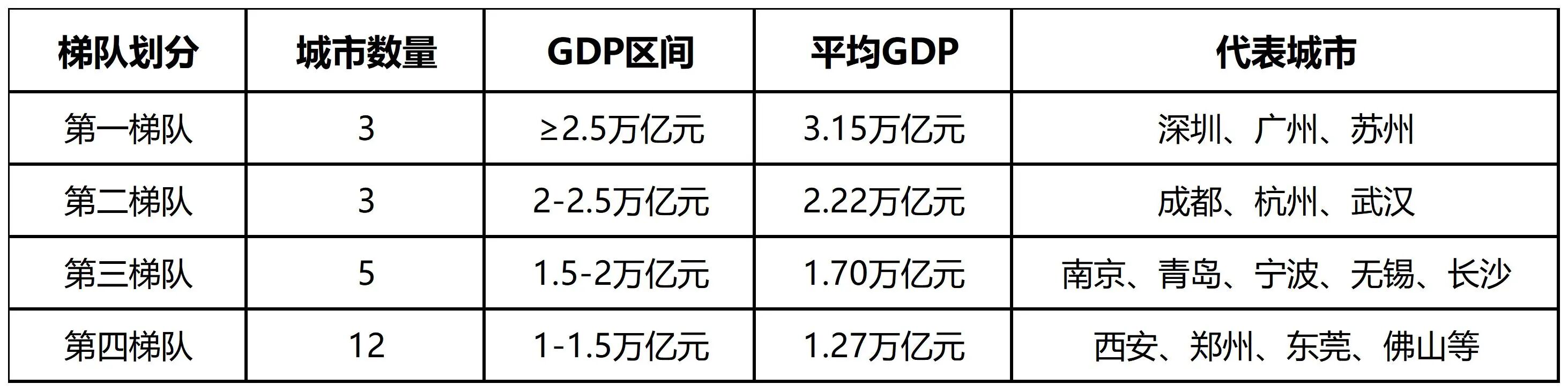 城市梯队发展整体呈现“头部集中、梯度递减、区域均衡”的分布格局,各梯队在规模体量、发展能级上差异显著,主要特征如下: