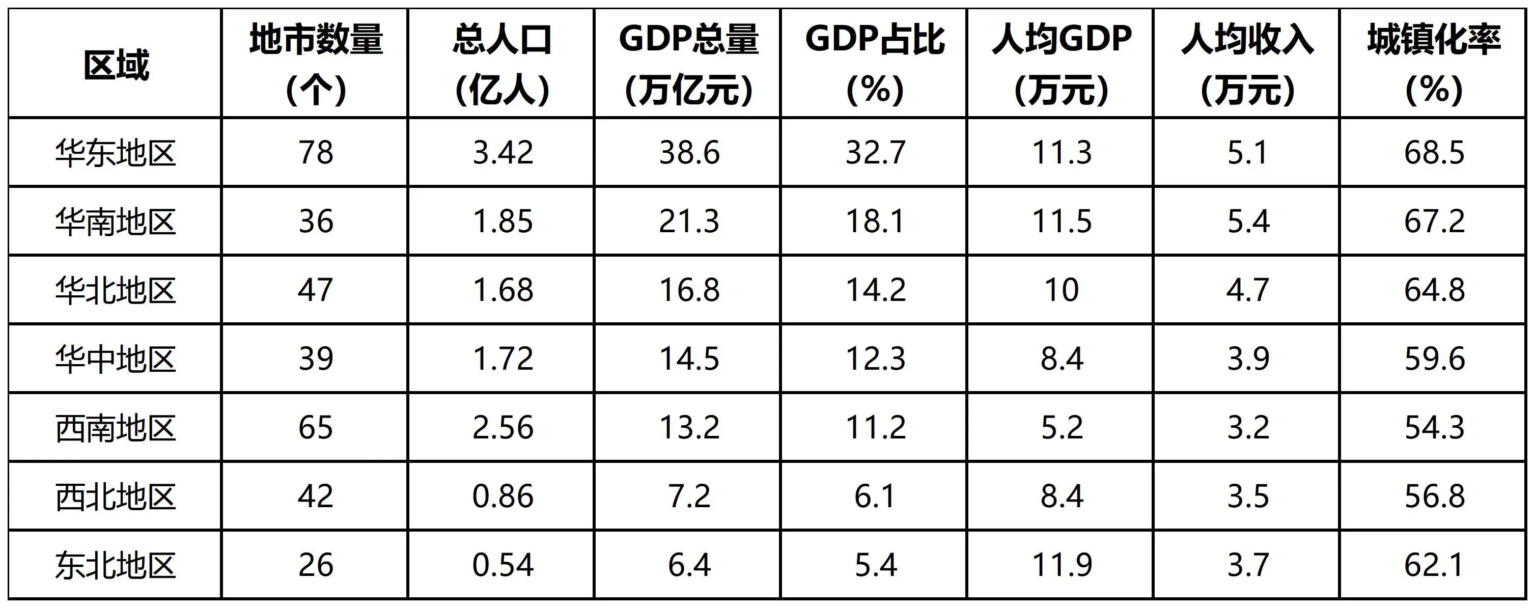 将全国划分为华东、华北、华南、华中、西南、西北、东北七大区域,各区域发展呈现显著差异化特征: