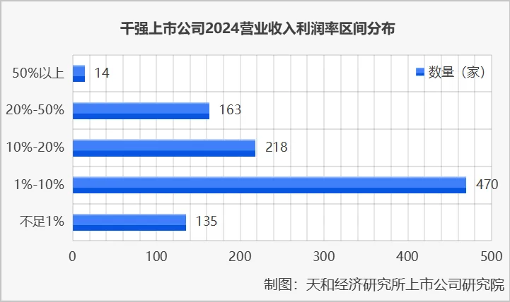 2025中国千强上市公司营业收入利润率整体表现出“以中低区间为核心、两端稀疏”的类正态分布特征,大多数企业集中在中等盈利区间,高盈利和低盈利的企业相对较少,呈现出典型的橄榄型结构。其中利润率在1%-10%的企业数量最多,达到470家,企业数量占比接近一半,是最集中的区间,表明多数企业处于中等盈利水平,反映了市场竞争环境下的普遍盈利状况。利润率在10%-20%和20%-50%的企业数量分别为218家和163家,合计占比约三分之一,说明有相当一部分企业具备较强的盈利能力,处于行业中上游水平。利润率不足1%的企业有135家,占比13.50%,这部分企业盈利空间非常狭窄,可能面临较大的经营压力或处于微利行业。而利润率50%以上的企业仅有14家,占比最低,不到2%,属于高盈利的少数群体,这类企业通常具有独特的竞争优势,如技术壁垒、品牌溢价或垄断地位。