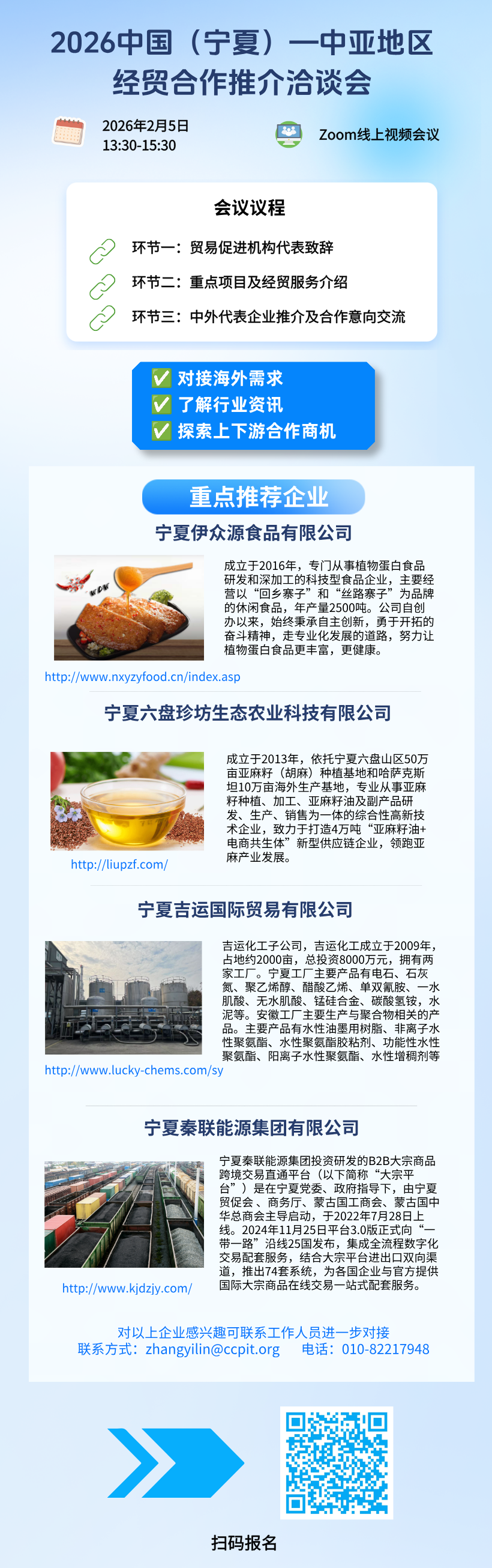 本次会议将以线上形式举行,拟邀请有限数量企业及商协会重点推介其核心业务或产品。参会者将有机会与来自中国、中亚五国、蒙古和俄罗斯的商协会,以及特色农产品、食品、畜牧业、大宗商品和跨境电商等领域的外方头部企业进行实时交流。特此诚邀相关行业企业积极报名参会,共同合作,创造并把握宝贵商机!