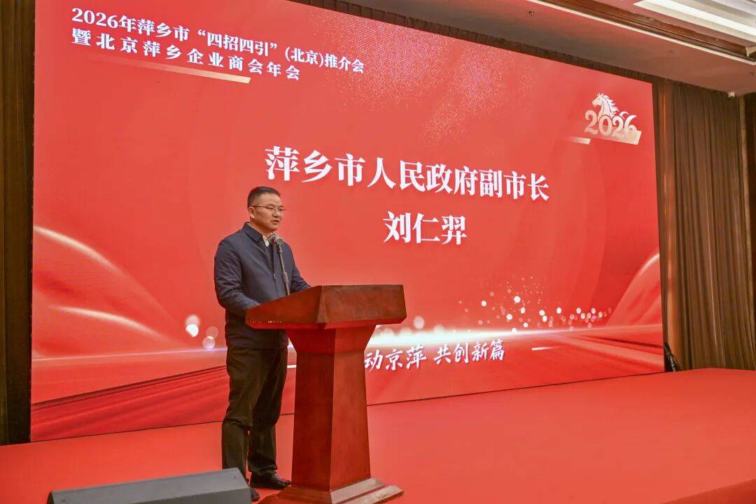 1月17日,2026年萍乡市“四招四引”(北京)推介会在首都北京成功举办。中信集团原董事长、中信改革发展研究基金会理事长孔丹,民政部社会福利中心党委书记、主任甄炳亮,中国老龄协会原一级巡视员曹健受邀出席。市人民政府副市长刘仁羿出席大会并讲话。萍籍乡友、各界人士代表、京津冀地区的企业家代表、以及北京萍乡商会会员企业等200多名嘉宾参加大会。