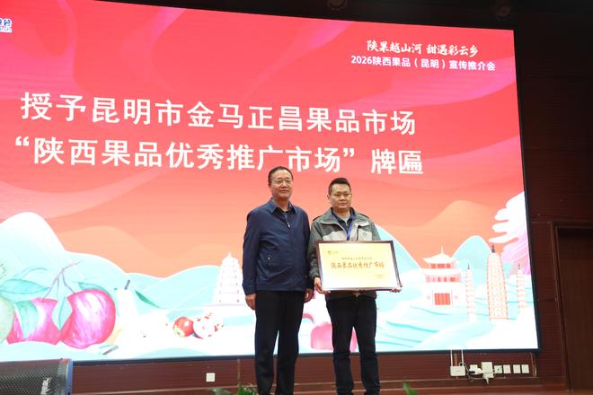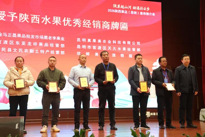 为表彰先进、深化长效合作,推介会现场举行了隆重的授牌仪式。陕西省果业中心党委书记宋勇为昆明市金马正昌果品市场授予“陕西果品优秀推广市场”牌匾,肯定其在陕果流通中的重要平台作用;陕西省农业农村厅市场与信息化处处长罗建强为云南昆明金马正昌果品批发市场黑老李果业、优鲜美佳连锁超市等6家企业授予“陕西水果优秀经销商”牌匾,感谢他们长期以来对陕果推广的大力支持。