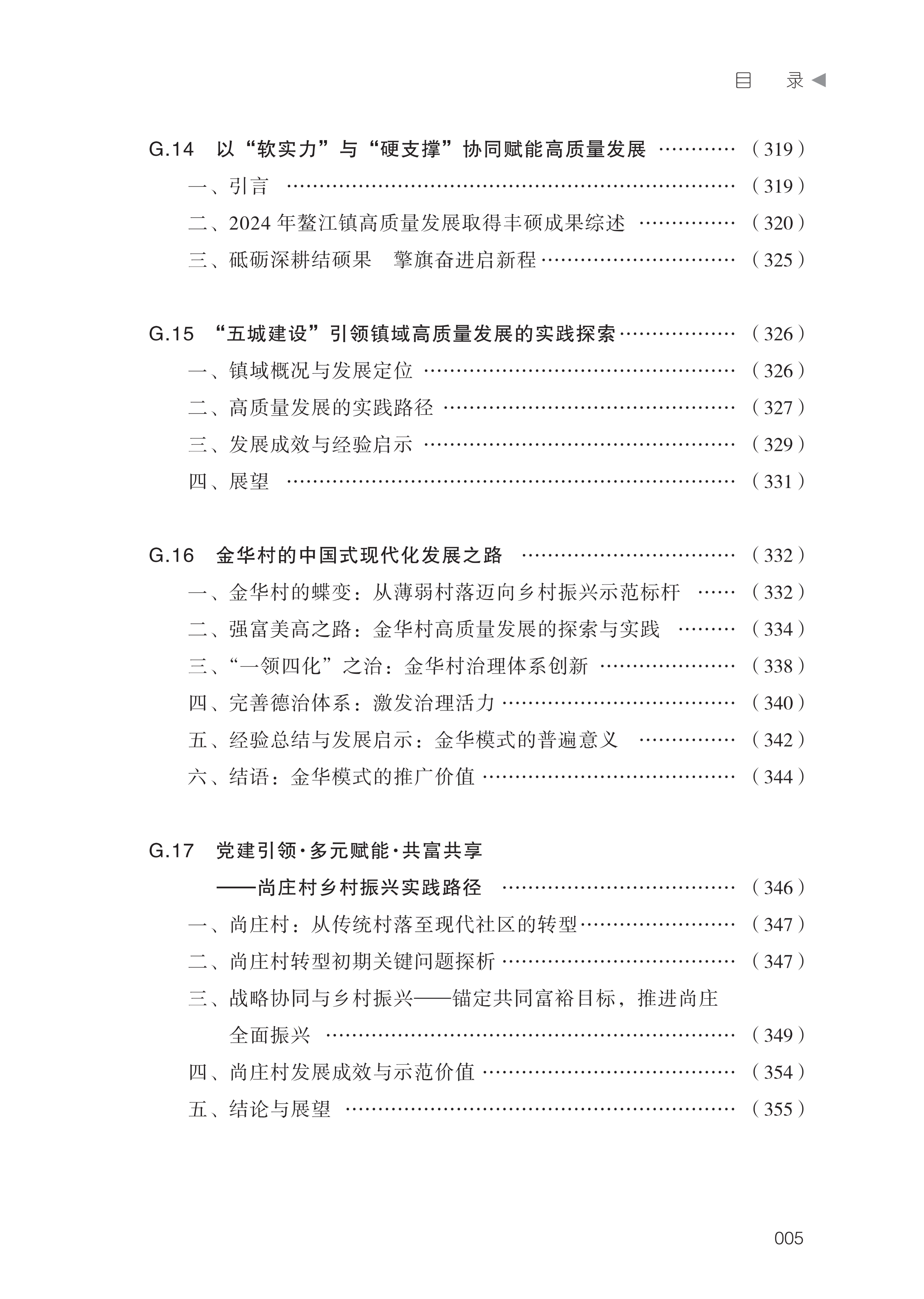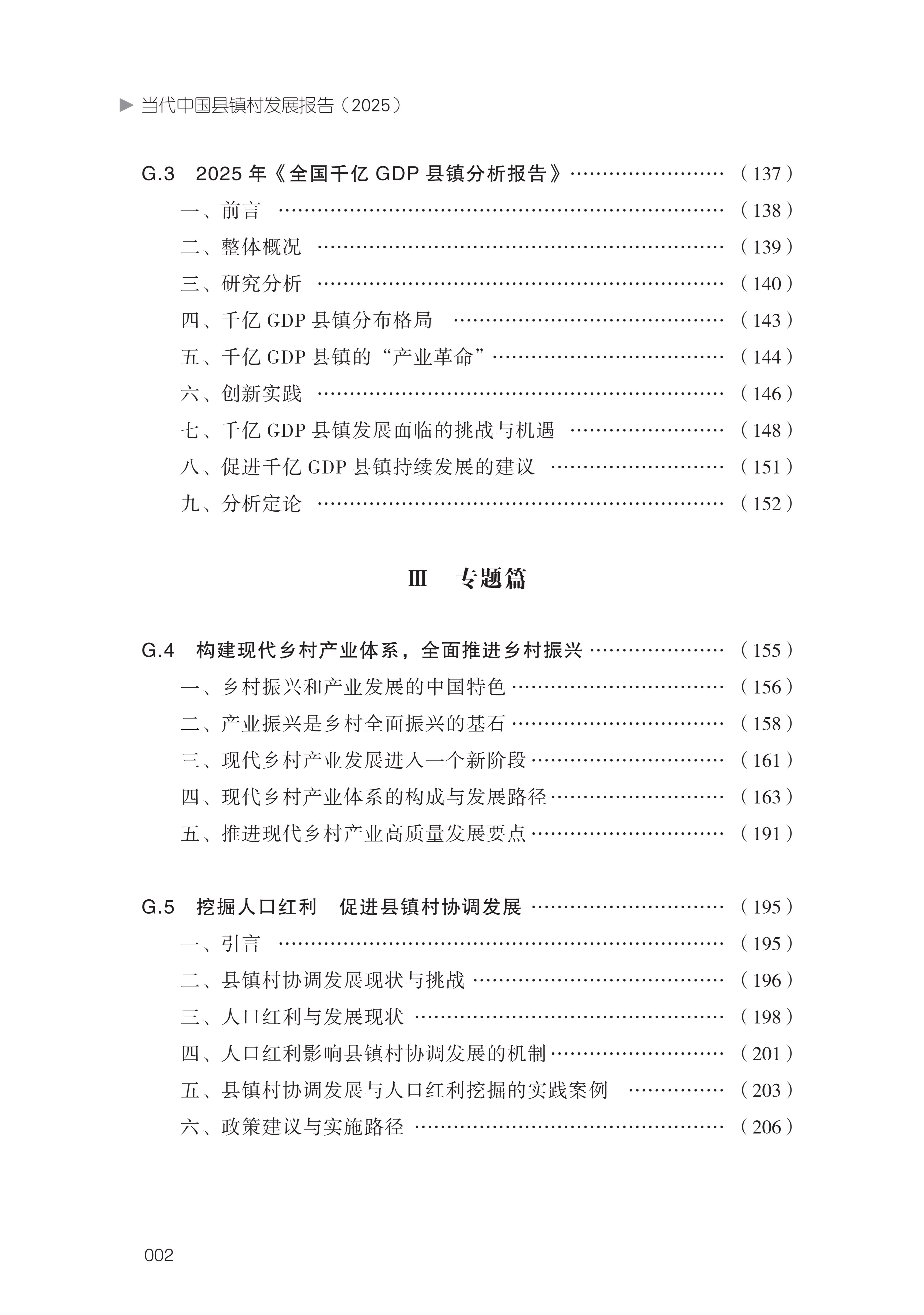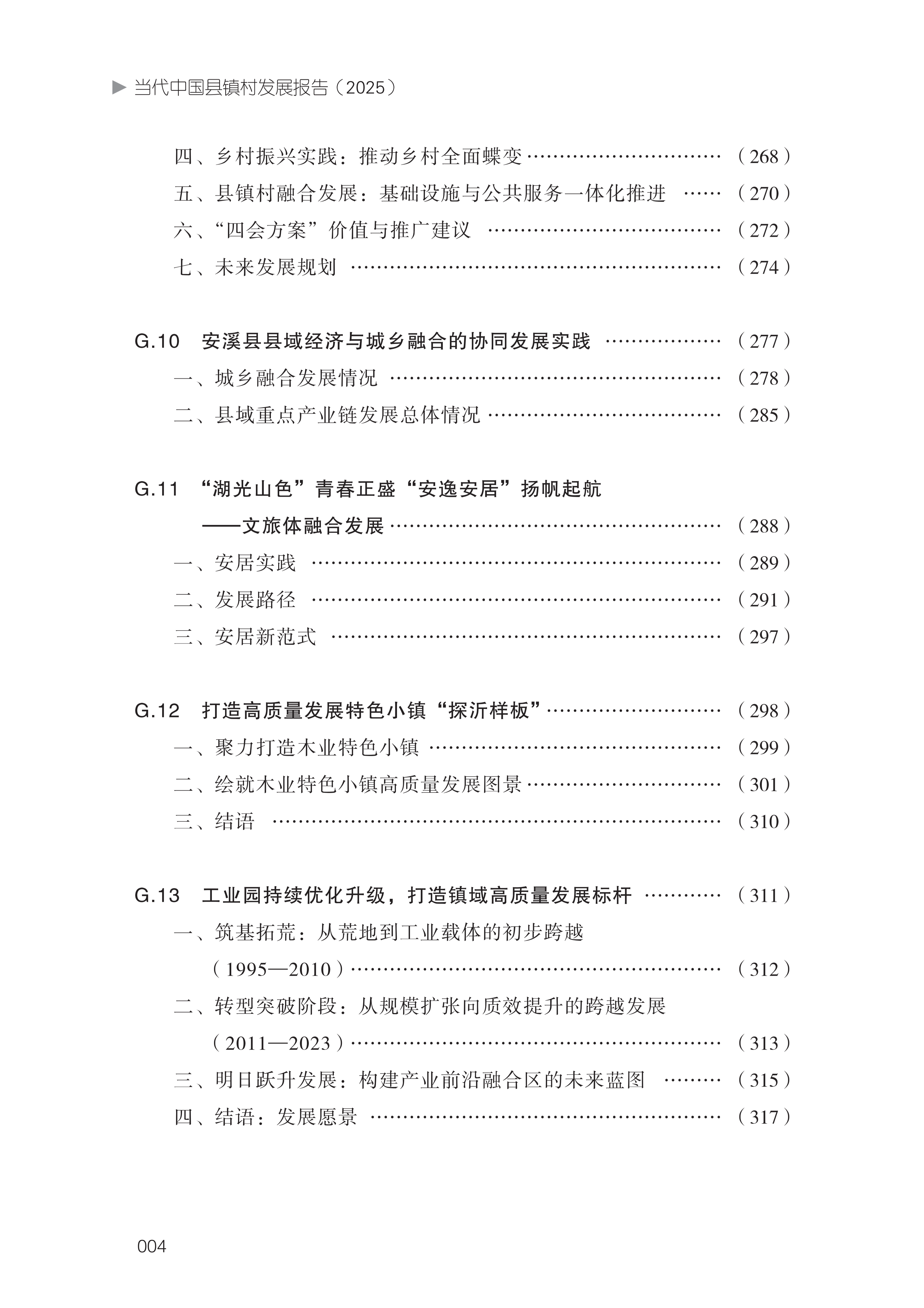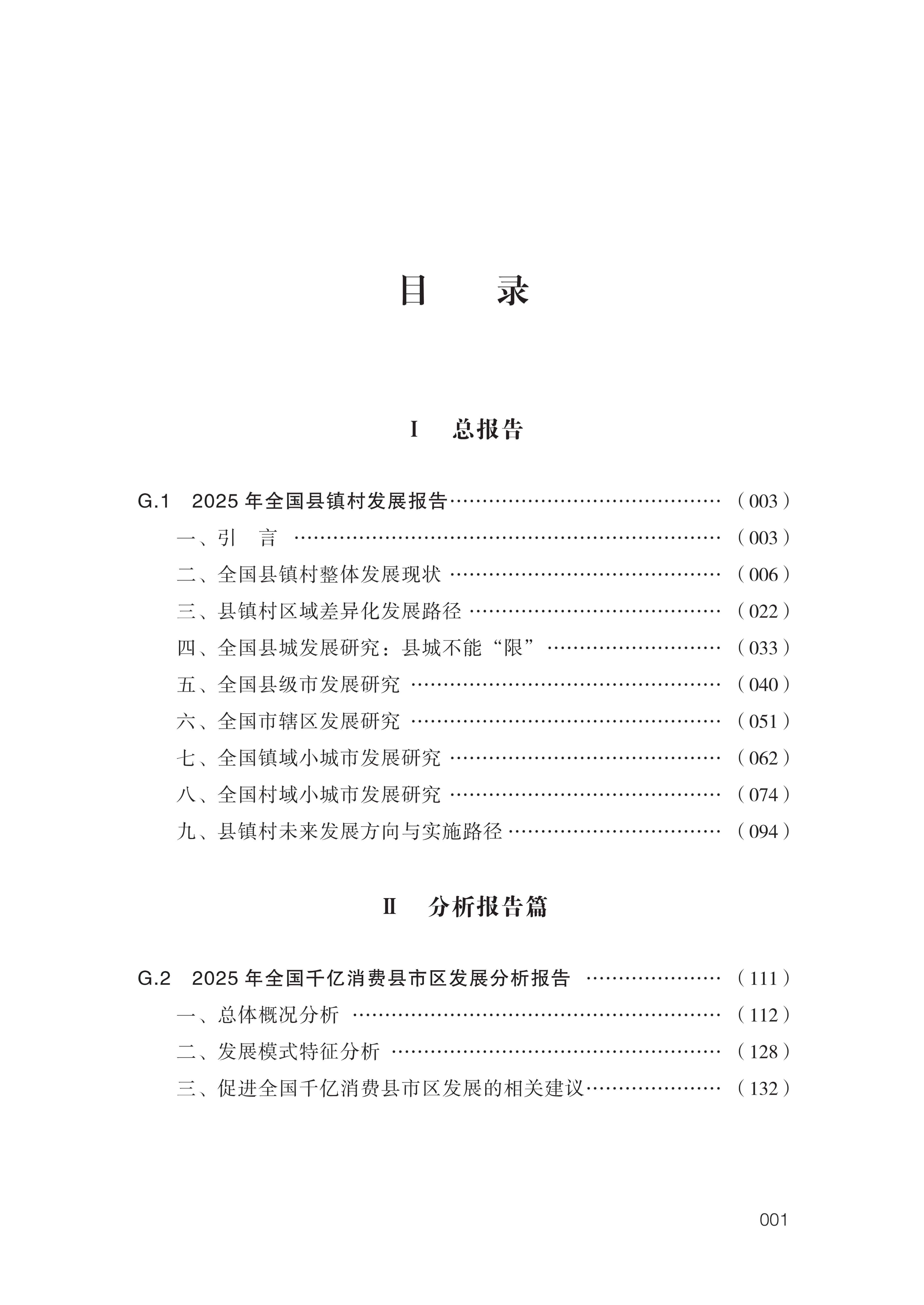 即将出版的这本《当代中国县镇村发展报告(2025)》,围绕上述重 要议题作出了系统性、创造性的研究。细读报告,其鲜明特点令人印象 深刻:在研究视角方面,报告突破以往的局限,把县镇村作为一个有机 整体进行系统研究,以“县域统筹—镇域节点—村域基础”的认知,揭 示了三者间的内在联系与协同发展的基本逻辑。在分析框架方面,报告 构建了“东部—中部—西部—东北”四维分析模型,梳理了不同区域县 镇村的发展特征、比较优势和主要问题,为因地制宜制定发展策略提供 了科学依据。所选择的十多个具体案例,涵盖了东中西部和东北各区域和县镇村各层级,具有很强的代表性,能为各地区实现特色发展提供有 益启示和有效借鉴。在理论探索方面,报告就县镇村经济社会发展的一 些关键问题阐述了独到见解,其中对“镇域小城市”和“村域小城市” 两个新概念的界定和研究,尤其具有创新性和学术价值。在政策建议方 面,报告对县域、镇域、村域三个层级的发展目标和实施路径都提出了 务实且别具新意的建议,县域打造城乡融合先行区、镇域建设节点枢纽、 村域培育经济强村等主张,具有很强的针对性和可操作性。总体来看, 报告既有对县镇村发展现状的梳理、对所面临的难点堵点的剖析,又有 对发展趋势的评估、对推进思路的阐述,是一部兼具理论深度、实践温 度与政策高度的著作,字里行间体现出编著者的专业素养和真挚情感。