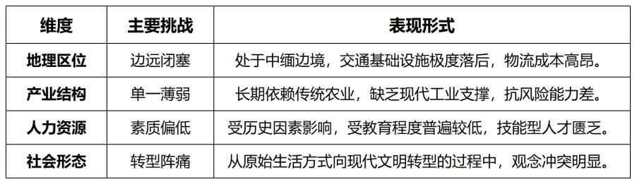 下表列出了脱贫攻坚初期西盟县面临的主要发展瓶颈: