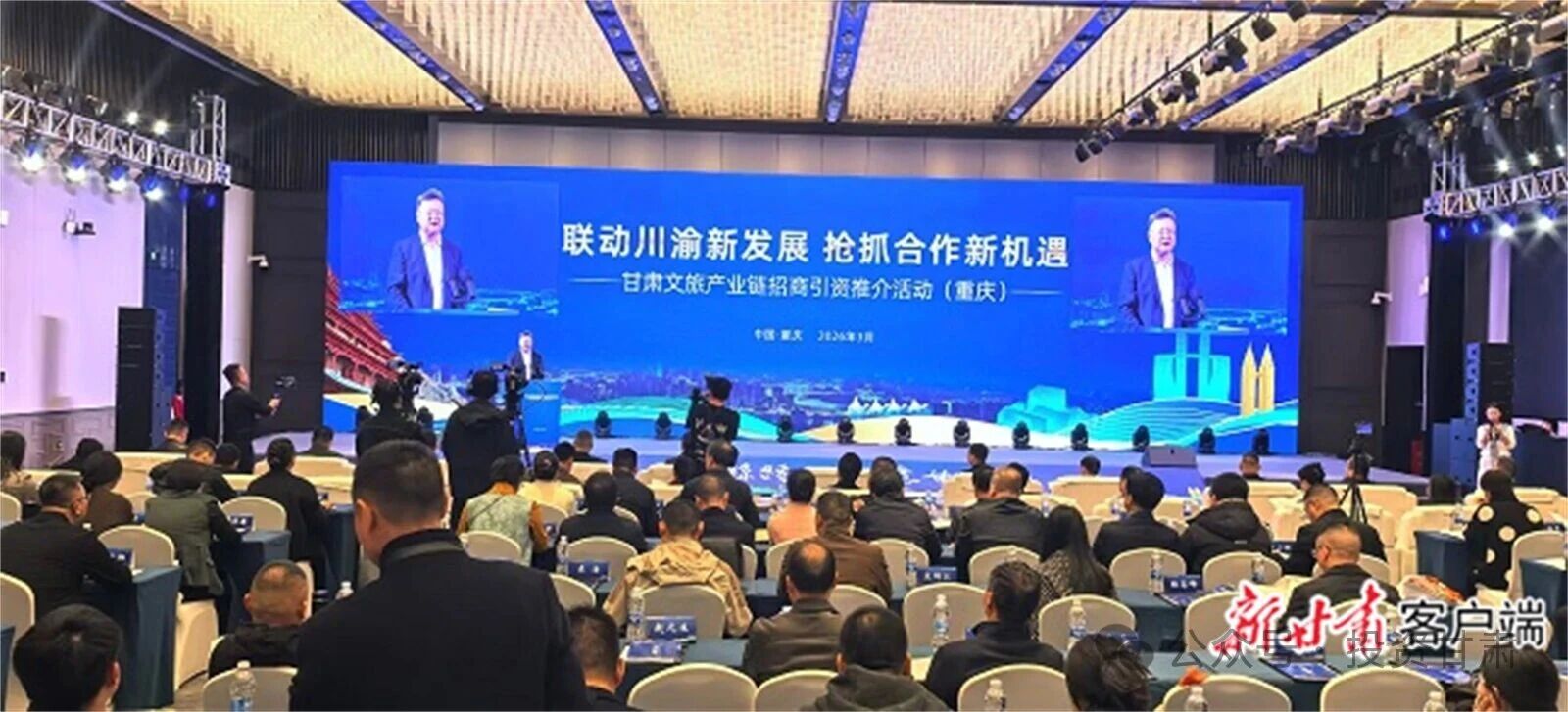 “联动川渝新发展·抢抓合作新机遇”甘肃文旅产业链招商引资推介会在山城重庆举行。 为深化陇渝文旅交流协作,精准对接优质文旅资源,3月5日,由甘肃省文化和旅游厅主办的“联动川渝新发展·抢抓合作新机遇”甘肃文旅产业链招商引资推介会在山城重庆举行,为两地文旅产业深度融合、协同发展搭建起坚实桥梁。 推介会上,甘肃聚焦丝路历史遗珍、壮美山水胜景、浓郁民族风情等核心文旅资源,围绕酒店民宿、文旅康养、低空飞行、文化制造业等重点赛道,详细解读产业布局与招商投向,全方位展现甘肃文旅产业的广阔发展前景与强劲投资潜力,让参会客商读懂陇原文旅魅力、看好投资机遇。兰州市、天水市、甘南州迭部县依次登台,精准推介本地特色文旅资源与重点产业链项目;甘肃公航旅天马投资有限公司结合实操经验,分享文旅项目打造思路与未来发展规划,进一步增强客商投资信心。 活动现场亮点纷呈,甘肃省博物馆、白银市文化广电和旅游局等12家单位集中布展,精选特色物产、非遗手作、文创精品集中亮相,全方位彰显陇原文创底蕴,助力招商对接、资源转化与产业落地。甘肃省文化和旅游厅与重庆市文旅发展委深入交流,共同阐释“文化互鉴、游客互送、产业互融”协调联动机制,双方达成共识,将紧扣新时代西部大开发战略部署,发挥陇原丝路文化、自然风光与巴渝山水人文、都市文旅的互补优势,携手共谋文旅合作新篇章。