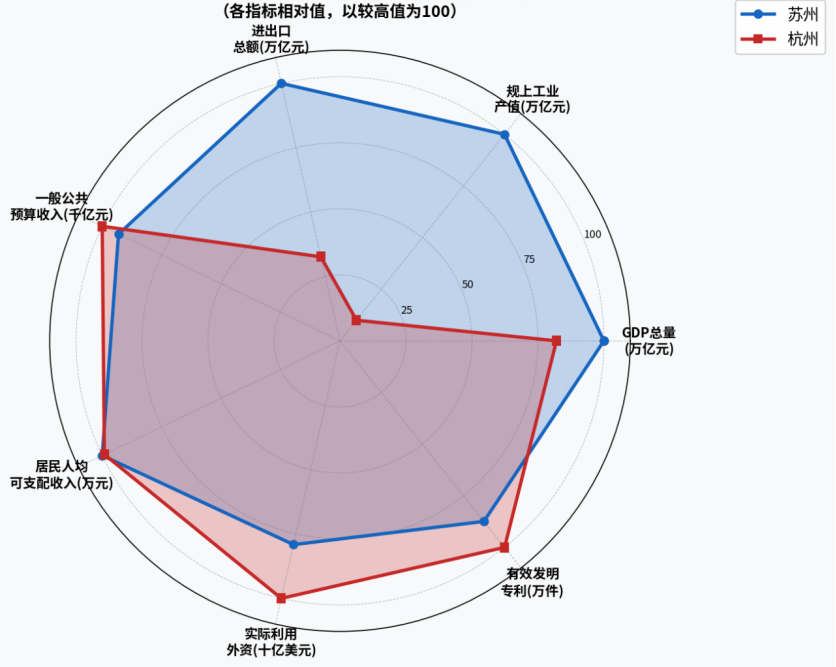 通过对苏州市与杭州市2024—2025年最新经济社会指标的全面对比分析,两座城市的综合实力轮廓清晰呈现。如图6所示,在经济总量、规上工业产值、进出口总额三个维度,苏州具有压倒性优势;在实际利用外资、有效发明专利、财政收入三个维度,杭州则略胜一筹或旗鼓相当;在居民人均可支配收入方面,两市不相上下,均处于全国领先水平。