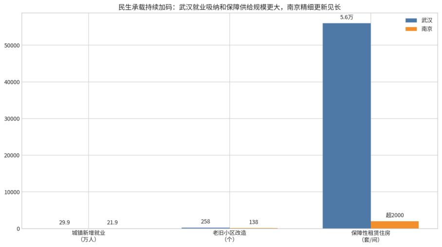 经济发展最终要体现到人民生活改善上。从民生数据看,武汉和南京都把稳就业、保民生、强服务摆在更加突出的位置。武汉2025年城镇新增就业29.9万人,新增高校毕业生就业创业31.4万人,社会保险新增参保47.3万人次,筹集建设保障性租赁住房5.6万套(间),改造老旧小区258个。这些数据充分表明,武汉作为超大城市,对人口、就业和住房保障的承接能力极强,具备明显的“吸纳型城市”特征。