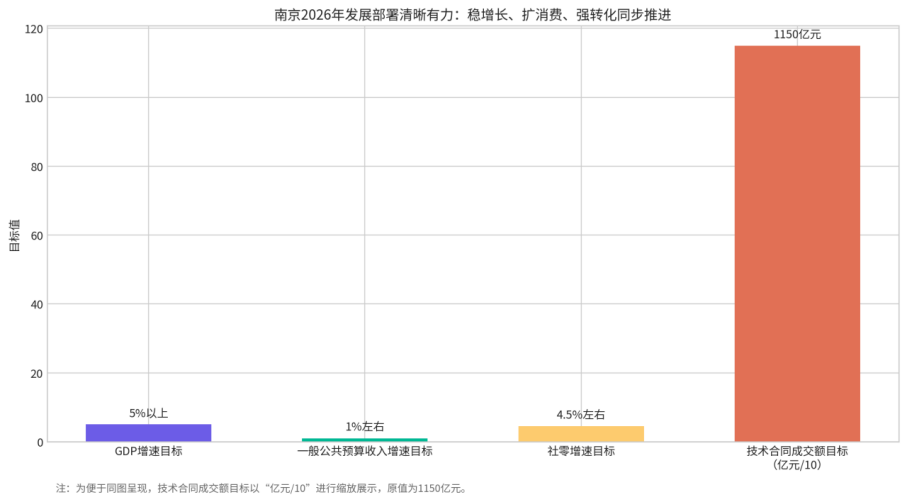 南京2026年则在总体目标之外,进一步通过《2026年市政府主要工作目标任务分解落实方案》把重点任务细化为可操作的指标体系:GDP增长5%以上,一般公共预算收入增长1%左右,社会消费品零售总额增长4.5%左右,技术合同成交额达1150亿元,亿元以上项目招引1200个,智能电网产业规模突破5700亿元,集成电路产业规模达1100亿元,工业机器人产量达6.5万台,认定国家高新技术企业3500家,发布1000个应用场景清单。