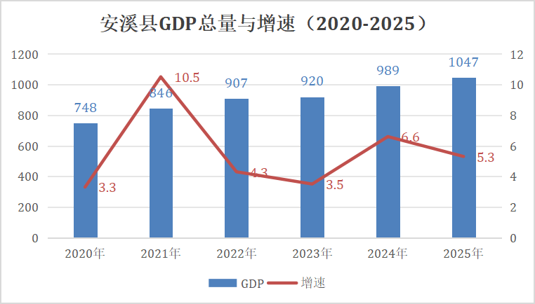 2025年,安溪县交出了一份令人瞩目的经济答卷。全县实现地区生产总值1046.94亿元,按可比价格计算,比上年增长5.3%。这一数字不仅标志着安溪正式迈入“千亿县”俱乐部,更印证了其在复杂宏观经济环境下的强劲韧性与内生动力。从2020年的748亿元到2025年的1046.94亿元,五年间GDP总量增长超过43%,跨越了三个百亿台阶,这是安溪县域经济发展史上具有重大历史意义的里程碑。