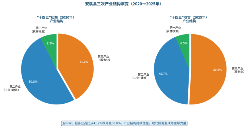 经济总量的跃升往往伴随着产业结构的深刻变革。回顾“十四五”期间,安溪县的产业结构经历了从“二产主导”向“三产驱动”的历史性转变。2020年,安溪县三次产业结构比例为7.5:50.8:41.7,工业占据绝对主导地位;而到了2025年,这一比例优化为6.5:42.7:50.8,第三产业占比首次突破50%,成为拉动经济增长的第一引擎。