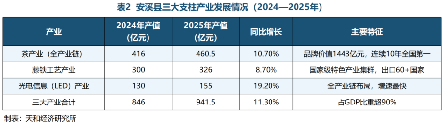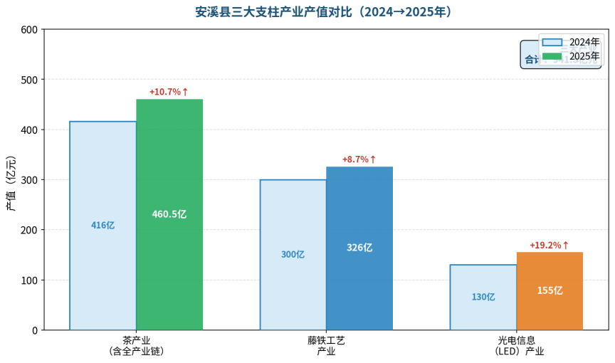 安溪的千亿跨越,并非建立在单一产业的孤军奋战之上,而是得益于茶产业、藤铁工艺、光电信息三大支柱产业的协同共进。这三大产业如同三根坚实的支柱,共同撑起了安溪经济的宏伟大厦。2025年,三大支柱产业合计产值达到941.5亿元,占全县GDP的比重超过90%,产业集聚效应显著。