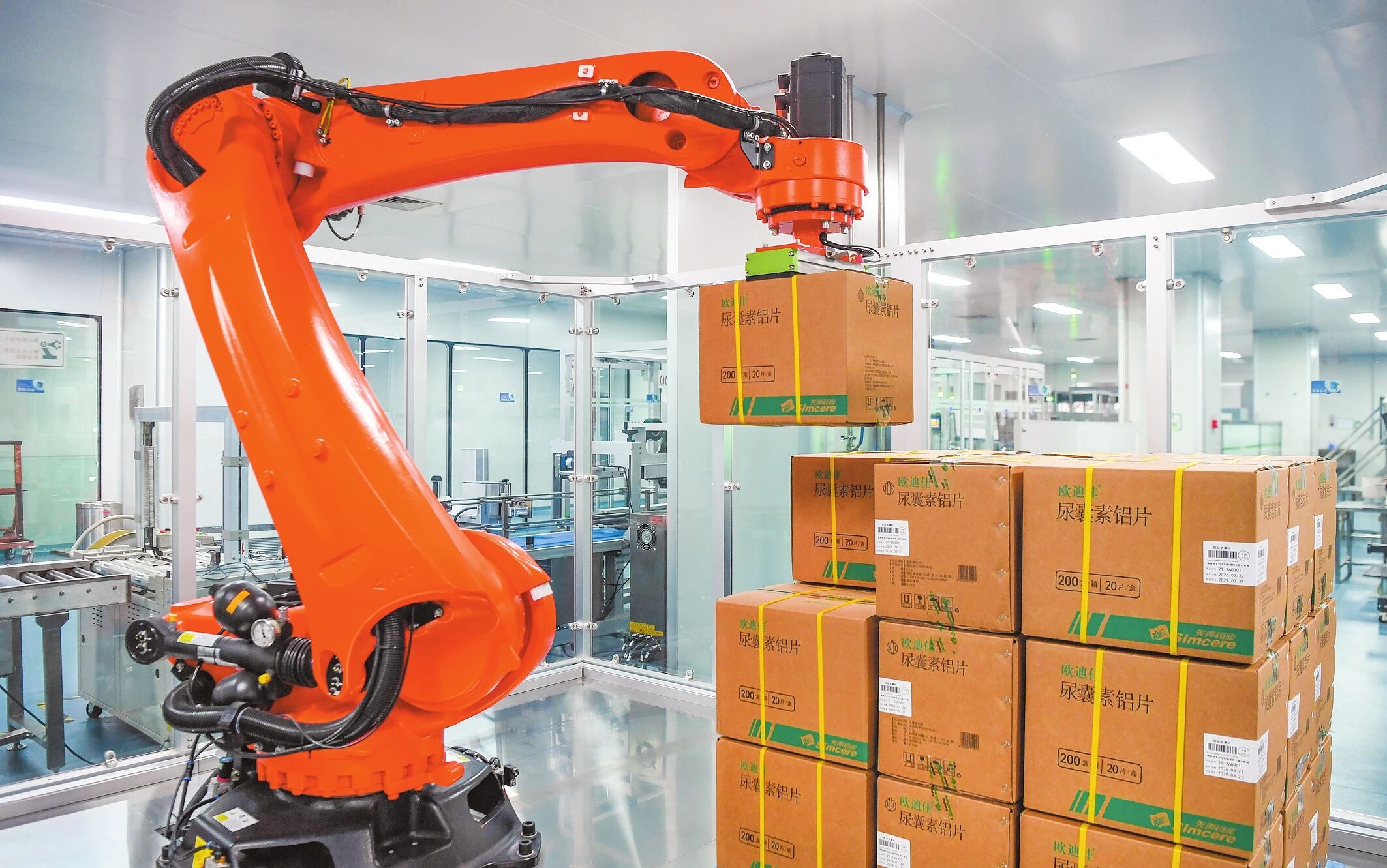 在海南先声药业海口药谷生产基地内,巨臂机器人有条不紊地将装箱完毕的药品码放整齐。海口市融媒体中心记者 康登淋 摄