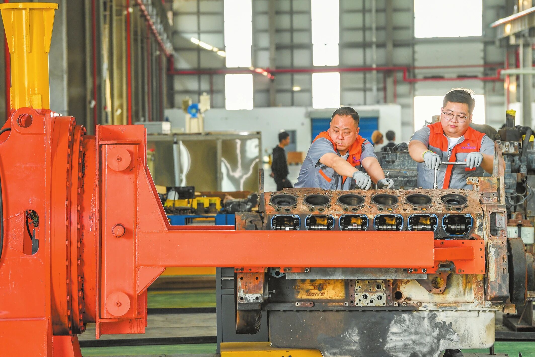 在海口综保区的中车国际车辆产业(海南)有限公司生产车间内,工人维修来自境外的矿卡柴油发动机。海口市融媒体中心记者 康登淋 摄