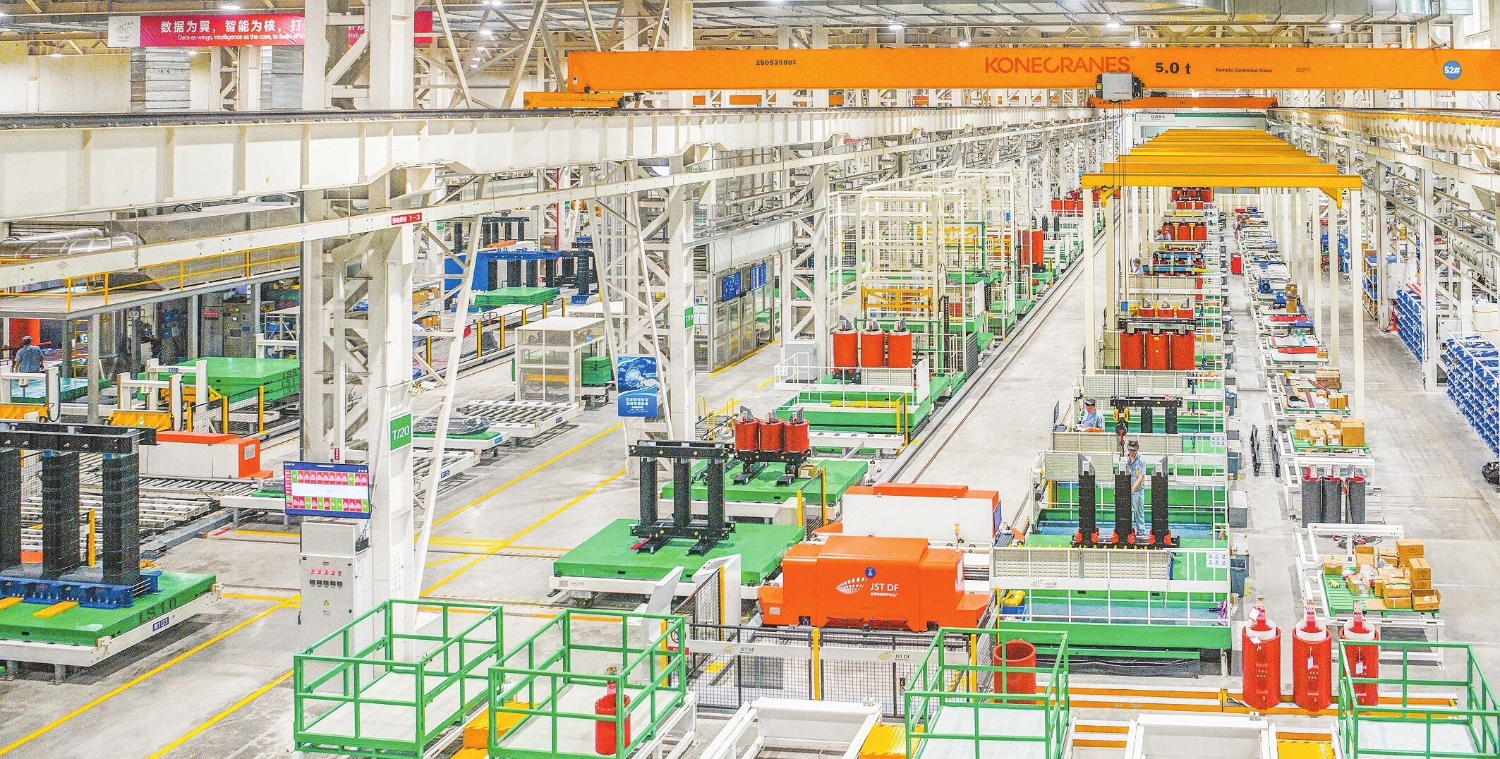 近日,在金盘科技海口数字化工厂装配车间里,无人运输车往来搬运物料,一台台干式变压器通过多道工序后走下生产线。海口市融媒体中心记者 康登淋 摄