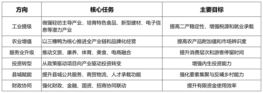 但三穗的真正价值,不在于若干指标增长本身,而在于其开始形成一种较为清晰的县域上升逻辑:以优势轻纺推动工业底盘重塑,以三穗鸭品牌化带动农业价值跃升,以文旅康养扩展服务业空间,以项目储备和政策争取稳住投资底盘,以治理整合和协同帮扶守住底线并积累后劲。