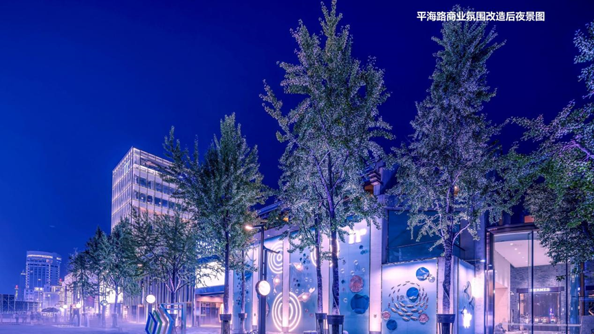 夜景照明与景观氛围相得益彰,规划设计了步行街西端湖滨处长126米的音乐喷泉,结合平海路两侧银杏树布置的雾森系统喷射的轻柔水雾营造出朦胧的“薄雾森林”夜景环境。四组以季节为主题的夜景泛光照明,将西湖春的温润淡雅、夏的娇艳欲滴、秋的饱满圆融、冬的苍翠高冷娓娓道来。建筑照明采用“杭州墙门”元素,以特定色温灯光实现自然泛光效果;路口与地面照明融入茶园、油纸伞等江南元素,再通过时控与智慧调光技术,平衡节能需求与夜景层次,让夜晚的街区更具魅力。
