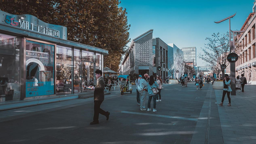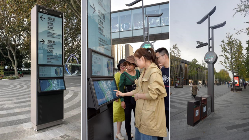 项目使集成应用5G技术、大数据、人工智能技术的智慧终端设施与步行街区环境相融合,规划智慧终端设施的配置布局,并与垃圾桶、标识和广告等进行整合设计,完成了智慧灯杆、智慧导览屏和云上直播间的外观设计。智慧灯杆集调光、监控、紧急呼叫等功能于一体,可实时播报信息、疏导人流;智慧导览屏动态更新停车、公交、餐饮等实用信息,还为残障人士提供无障碍查询服务。街角的“湖上直播间”以轻盈造型融入街区,让传统街区与数字经济深度融合。