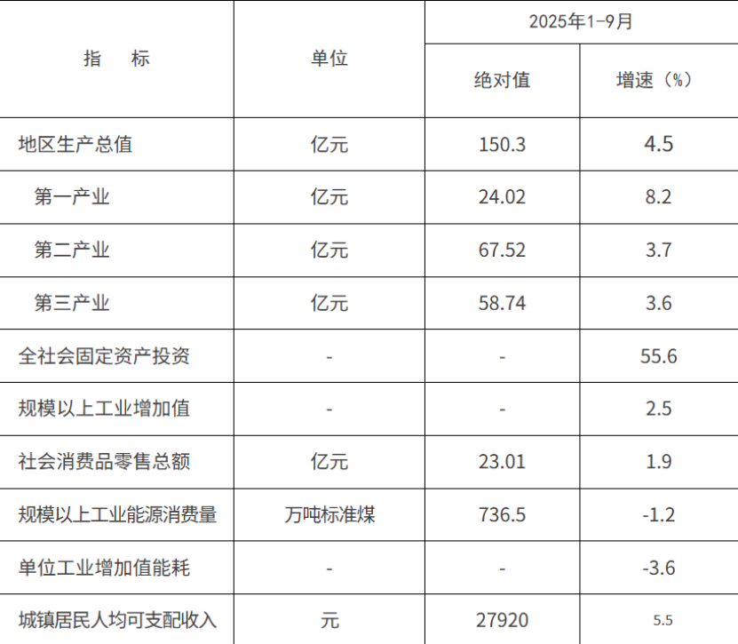 2025年1-9月,银川市西夏区实现地区生产总值345.72亿元,同比增长6.0%;规模以上工业增加值同比增长6.3%;固定资产投资同比下降37.0%;社会消费品零售总额54.53亿元,同比增长6.3%;一般公共预算收入4.24亿元,同比增长8.7%;城镇居民人均可支配收入31744元,同比增长4.2%;农村居民人均可支配收入15845元,同比增长5.3%。