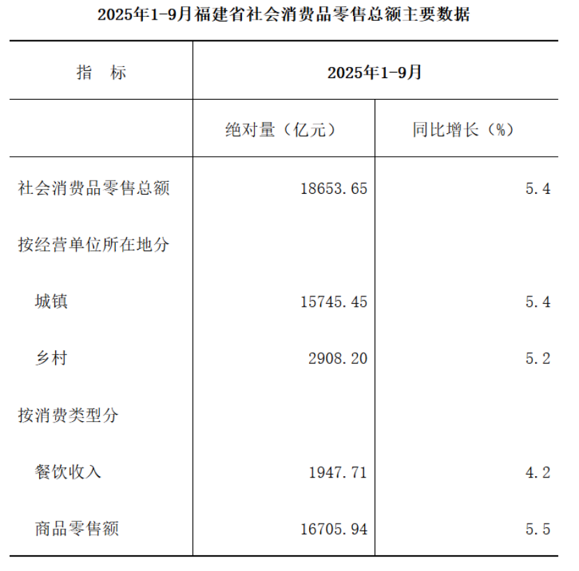 2. 2025年前三季度,福建省社会消费品零售总额18653.65亿元