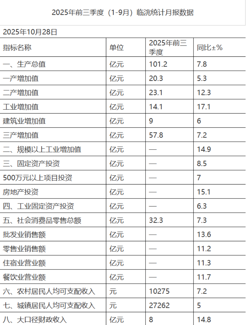 7.2025年前三季度,临洮县规模以上工业增加值同比增长14.9%