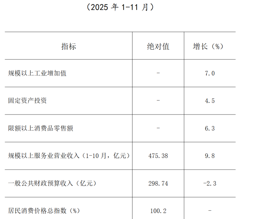 2025年1—11月,苏州市姑苏区实现一般公共预算收入62.61亿元,同比增长0.9%;实现社会消费品零售总额804.84亿元,同比增长1.9%;完成全社会固定资产投资166.68亿元,同比下降2.2%;完成规模以上工业总产值49.42亿元,同比下降4.6%。
