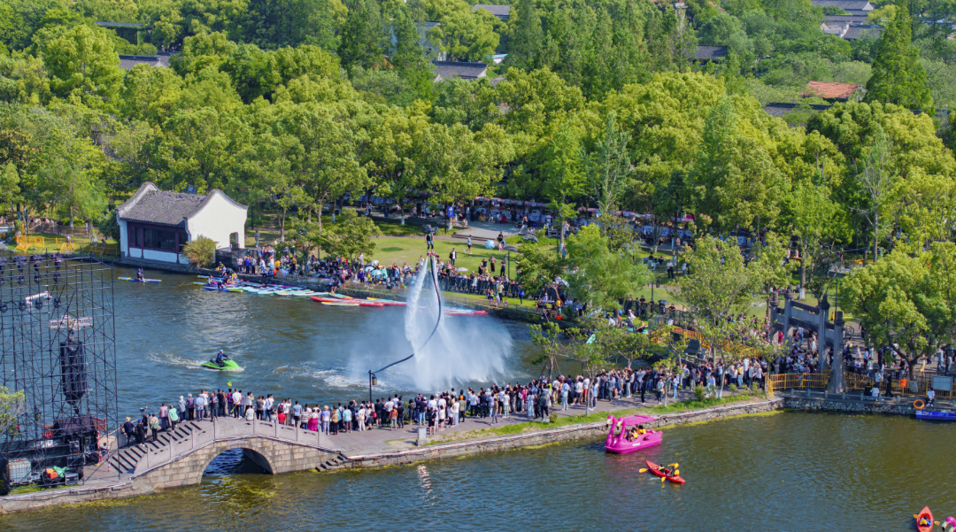 (下图)国庆中秋双节期间,慈湖水上表演吸引游客观看。