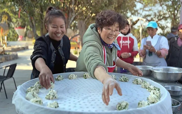 旅居者赵发英(图左二)教曼海村民小组的村民做花卷。 陶思源/摄