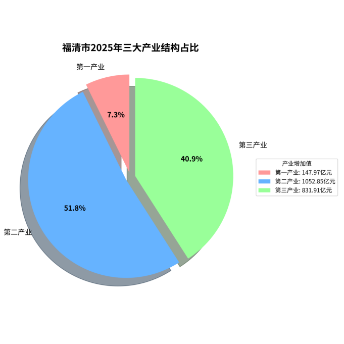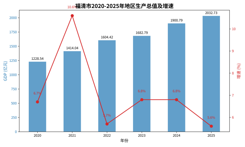 2025年,面对复杂多变的国内外宏观经济形势,福清市经济运行呈现出“稳中有进、进中提质、领跑福州”的良好态势。全市实现地区生产总值(GDP)2032.73亿元,同比增长5.6%。这一成绩不仅标志着福清市成功跨越2000亿元大关,更意味着在“十四五”期间,福清市GDP连续跨越8个百亿台阶,实现了从1229亿元到2032亿元的历史性跨越,增幅高达65%。这种持续的高速增长,充分彰显了福清市作为福建省县域经济排头兵的硬核实力。