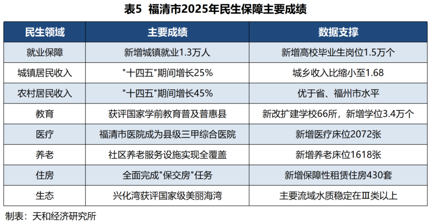 城镇、农村居民人均可支配收入分别比“十三五”末期增长25%、45%,城乡居民收入比从1.86缩小到1.68,优于省、福州市水平,城乡居民收入差距持续缩小,共同富裕的步伐更加坚实。2025年,发放稳岗扩岗补助337万元,新增城镇就业1.3万人、高校毕业生岗位1.5万个。发放失业保险金5694万元、社会救助金1.6亿元,兜底保障网更加牢固。