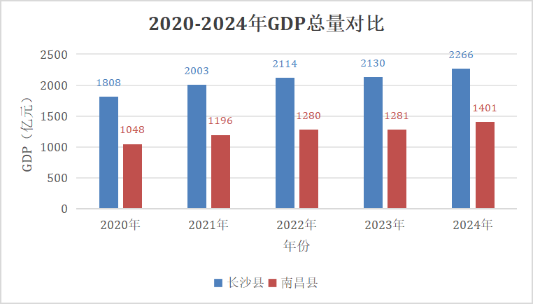 从近五年的发展轨迹来看,长沙县GDP从2020年的1808亿元增长至2024年的2266.35亿元,年均增量超百亿;南昌县则从2020年的1048亿元跨越至1401.44亿元。两县均保持了向上的增长曲线,彰显了中部大县的经济底盘之稳。