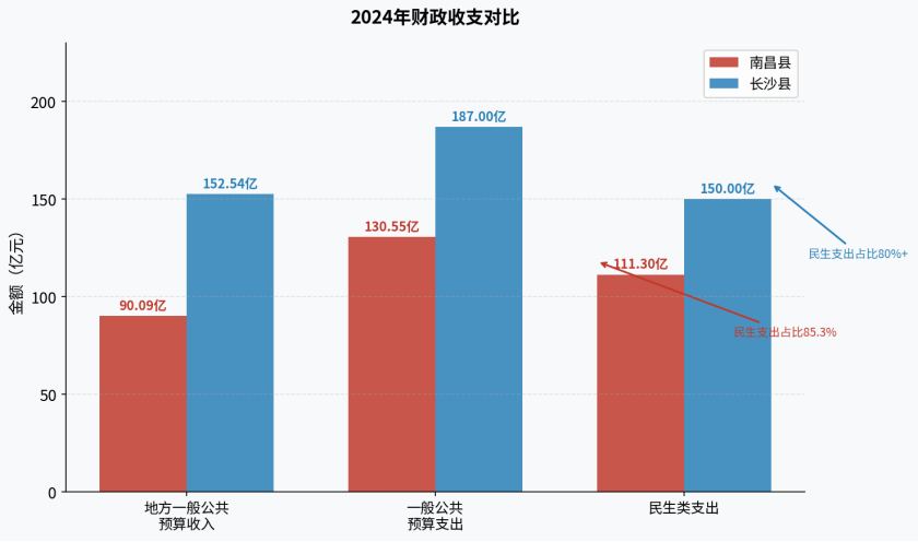 在财政支出方面,两县均坚持“过紧日子”,将有限的财力向民生领域倾斜。南昌县地方公共预算支出完成130.55亿元,其中民生类支出111.3亿元,占一般公共预算支出的比重高达85.3%。长沙县一般公共预算支出187.0亿元,民生支出占比同样保持在80%以上。这组数据充分证明,两县在做大经济“蛋糕”的同时,都在倾力分好“蛋糕”,让发展成果更多更公平惠及人民群众。