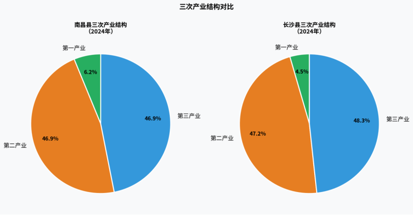 长沙县2024年三次产业结构为4.5:47.2:48.3。与南昌县相比,长沙县的第一产业比重更低,第三产业比重略高,产业结构呈现出更为明显的“三二一”特征,这与其作为省会城市核心区、现代服务业更为发达的定位相契合。