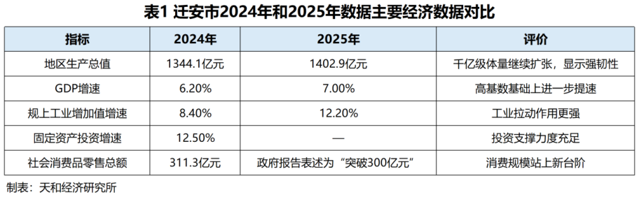 迁安首先让人印象深刻的,是它在县域经济版图中的规模优势。2024年,全市地区生产总值达到1344.1亿元,比上年增长6.2%;到2025年,这一数字继续攀升至1402.9亿元,增速提升至7.0%。在全国县域经济竞争日趋激烈、重工业城市面临多重约束的背景下,迁安仍能在千亿级高基数之上实现提速增长,本身就说明其经济运行具备较强的韧性和较高的组织效率。