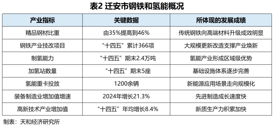 其次,迁安在新兴产业中最具辨识度的突破,是氢能产业。2024年,迁安市政府工作报告明确指出,全市制氢产能突破1.5万吨,成为京津冀最大制氢基地;到“十四五”期末,制氢能力进一步达到2.4万吨,建成加氢站5座,投放氢能重卡1200余辆,居全国县域前列。对于县域城市而言,这一成绩的意义非常突出。很多地方都在布局氢能,但真正能把制氢能力、加氢站布局、车辆应用场景和装备制造串成产业链的并不多。迁安的氢能布局,已经不只是示范,而是开始形成产业链条和区域品牌。