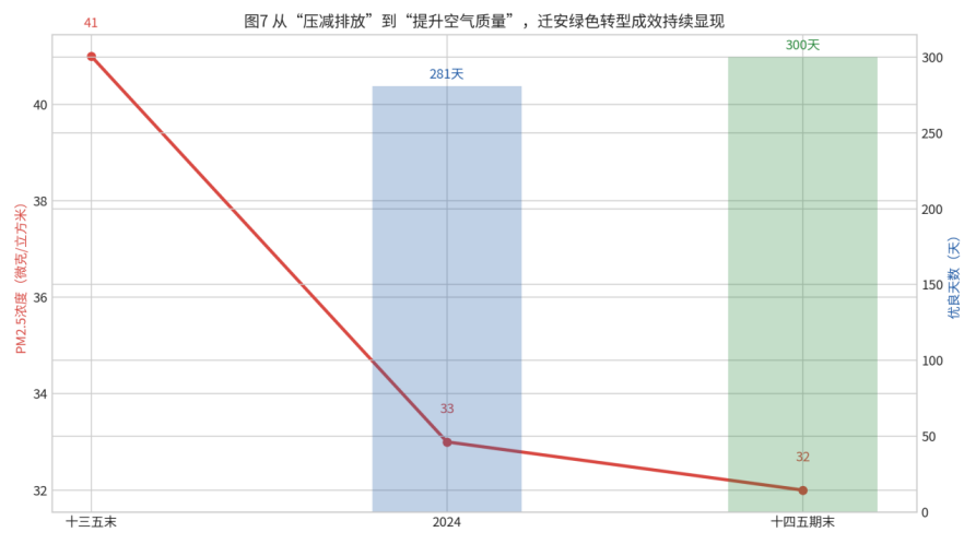 首先看最具代表性的空气质量指标。2024年,迁安全年PM2.5浓度为33微克/立方米,优良天数达到281天,同比增加24天,重污染及以上天数降至3天。“十四五”期间,PM2.5平均浓度由“十三五”末的41微克/立方米降至“十四五”期末的32微克/立方米,优良天数达到300天,占比提高12.3个百分点。这说明迁安的绿色改善不是某一年的偶然波动,而是已经形成了持续向好的趋势。