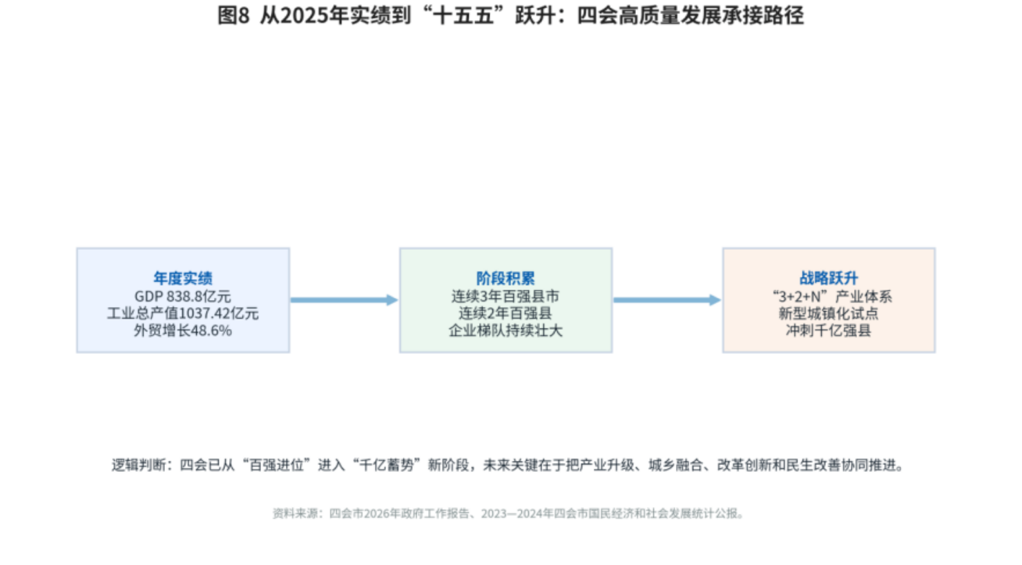 因此,对四会2025年的观察,应回答三个更关键的问题:第一,四会为什么能够在复杂环境中继续实现百强进位、千亿蓄势;第二,这种增长是短期修复,还是更高层次的结构升级;第三,四会从“十四五”收官迈向“十五五”开局,已经具备了怎样的现实基础与战略主动。本文的基本判断是:四会已经完成从“县域实力稳固”向“县域能级跃升”的关键转换,2025年是其从百强站位走向千亿蓄势、从产业积累走向战略突破的重要节点。