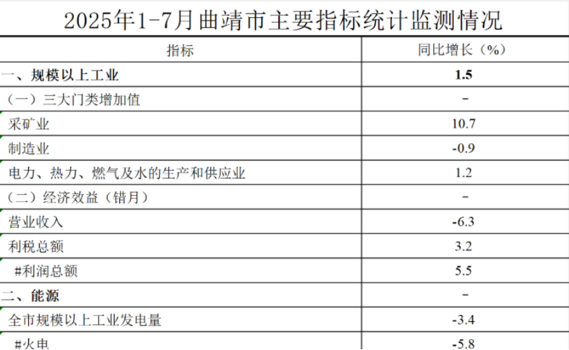 4. 2025年1-7月,曲靖市规模以上工业同比增长1.5%