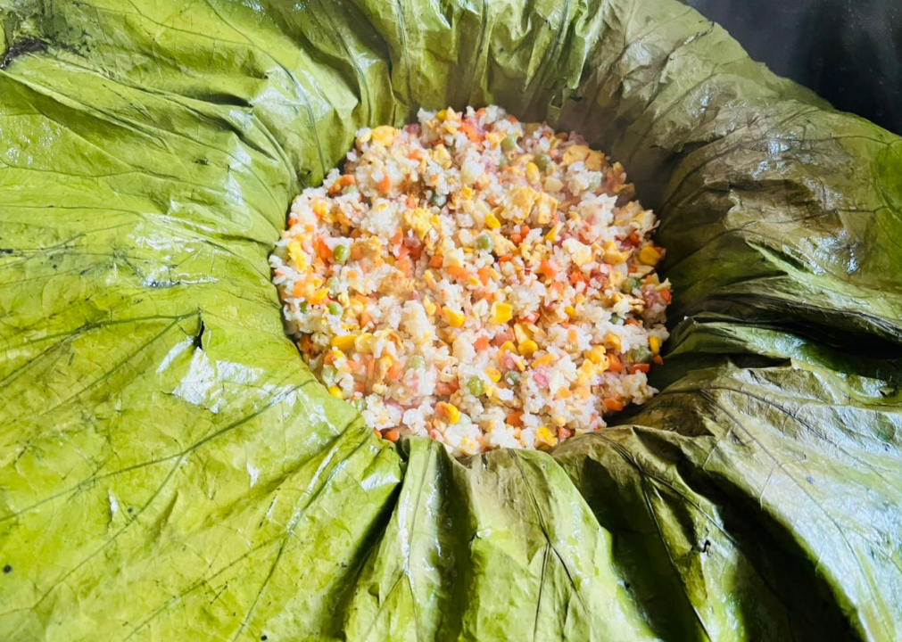 用当地新鲜的荷叶包裹糯米和食材蒸制而成,米饭带有荷叶的清香,风味独特。